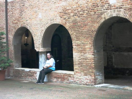 Anneken und ich halten uns lange in den alten Gemäuern auf, ehe wir weiter wandern. Wir müssen zur Toilette und haben Durst. Also machen wir eine kurze Pause in einer Bar, wo wir unter den Arkaden draußen sitzen können.