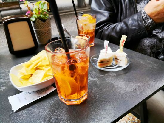 Wir bestellen Aperol Spritz. Dazu bekommen wir Toast mit Schinken und Käse, Chips und Erdnüsse, welch ein Service.