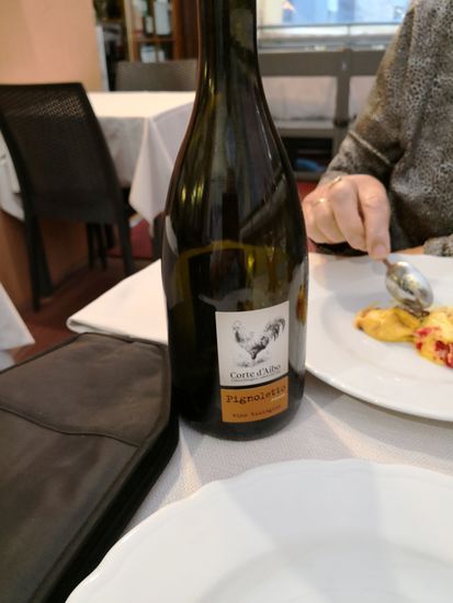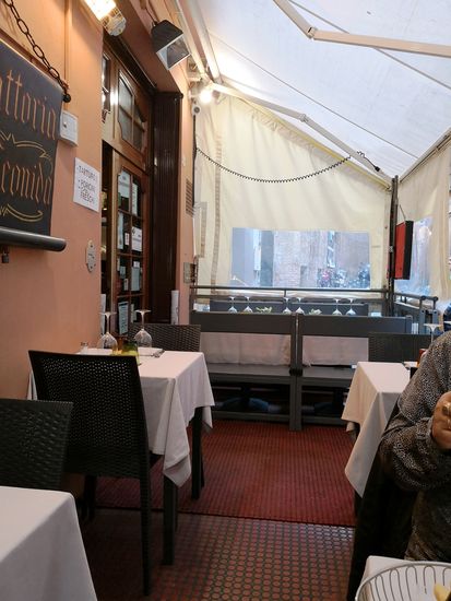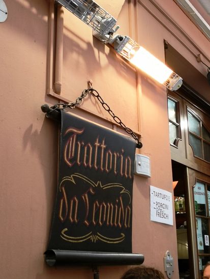 Unterwegs, im Viccolo Alemagna, entdecken wir die Trattoria da Leonida, sehr versteckt, aber innen gibt es keinen Platz mehr. Uns ist es dort eh viel zu warm, wir setzen uns also draußen an einen kleinen Tisch, geschützt durch eine Art Zeltdach. Den Heizstrahler hier benötigen wir auch nicht. Der Kellner ist verwundert. Die Italiener frieren eben eher als wir Deutsche oder Niederländer.