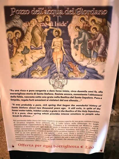 In der Kirche gibt es auch eine Wasserquelle, die in der Symbolik des Stefan-Komplexes, die auf der Passion Christi basiert, mit den Gewässern des Jordans identifiziert wird und sich aus archäologischer Sicht auf die heilige Quelle des bereits bestehenden Isis- Komplexes bezieht. Wahrscheinlich befand sich der Tempel der Isis in diesem Gebiet, denn der Kult der ägyptischen Göttin erforderte eine Quelle für Quellwasser.