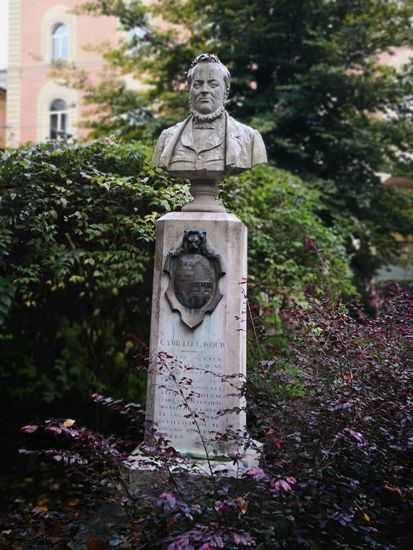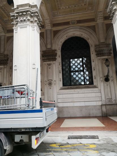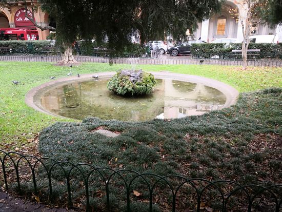 Nach der Besichtigung wandern wir im Nieselregen zur Piazza Cavour. Hier können wir nochmals die schön bemalten Arkaden sehen und fotografieren. Ein kleiner Park mit Brunnen ist uns auch ein paar Bilder wert, ehe wir von hier aus mit dem Taxi zurück ins Hotel fahren.