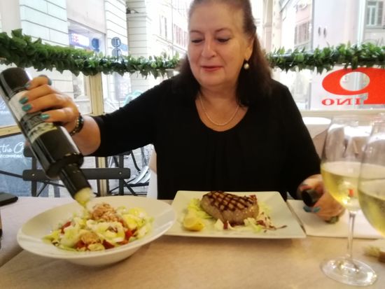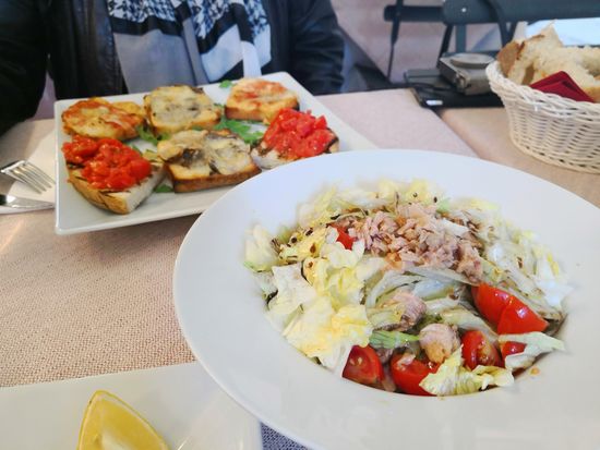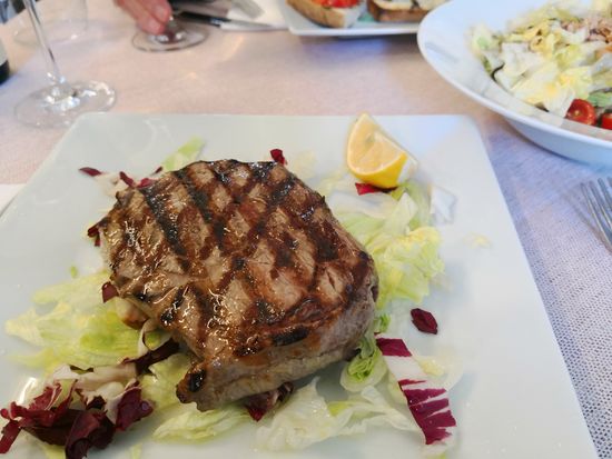 Anneken bestellt sich div. Geröstete Brote, ich einen kleinen Salat und ein Steak al Sangue. Der Salat ist riesig, können wir nicht aufessen, die Brote auch zu viel und laut Anneken nicht so besonders. Mein Steak allerdings ist hervorragend.