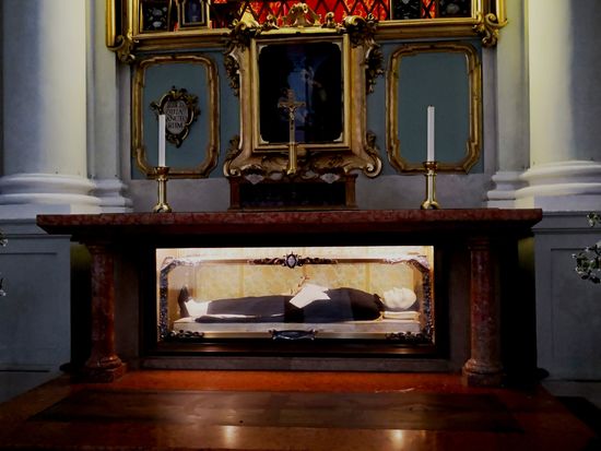 Der Körper des Hl. Domenico liegt in einem Sarg aus Zypressenholz, sein Kopf wird separat auf der Rückseite des Grabmals aufbewahrt, im Reliquienschrein des Goldschmieds Jacobo Roseto da Bologna (1383).