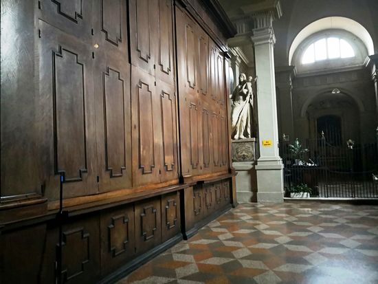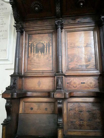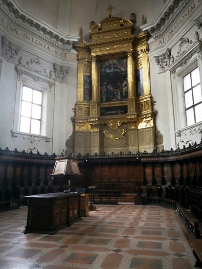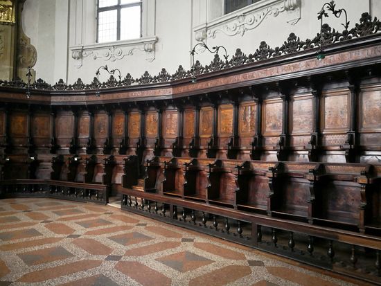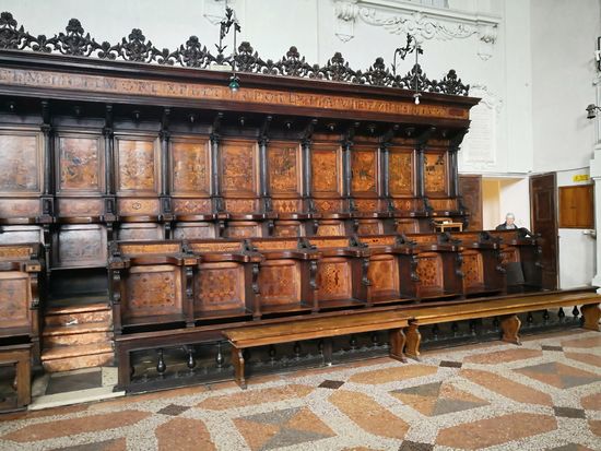 Die 102 hölzernen Chorstände sind ein exquisites Beispiel der Renaissance-Schnitzerei des Dominikaners Damiano da Bergamo, 1528-1530. Zwischen 1541 und 1549 wurden sie von demselben Künstler mit Intaglia (gravierter Edelstein) eingelegt, wobei eine Serie von Zeichnungen aus einem Buch von Giacomo Barozzi da Vignola verwendet und von seinem Bruder Stefano da Bergamo geschnitzt wurde. Die Arbeit wurde von Bruder Bernardino da Bologna beendet. Diese Verzierungen zeigen Szenen aus dem Alten Testament (rechts) und aus dem Neuen Testament (links).