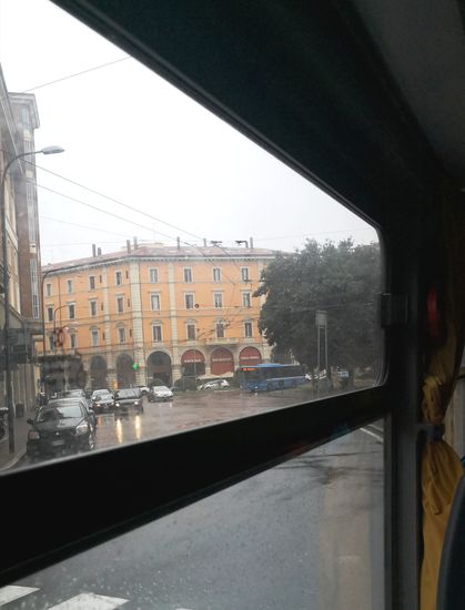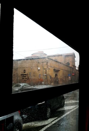 Nach der Besichtigung warten wir draußen auf unseren Bus. Leider hat man keine Aussicht von dem Hügel auf die Stadt Bologna. Es regnet stark und zudem ist es sehr nebelig. Schade.