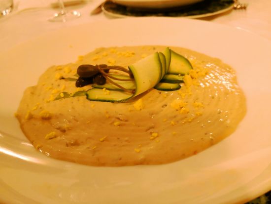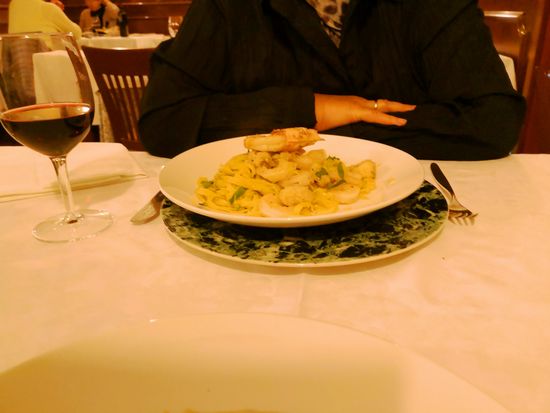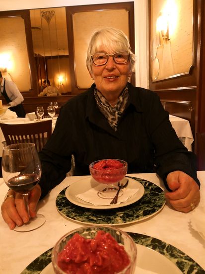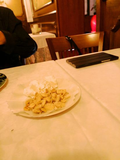 Zur Vorspeise nehmen wir geröstetes Weißbrot mit Ricotta und Anchovis. Wir teilen uns das. Anneken wählt Nudeln mit Rana Pescatrice (Seeteufel) und Gamberi und ich nehme Vitello Tonnato. Dazu haben wir eine Flasche Wein, Sangiovese aus der Region. Und als Nachtisch gibt es Himbeer-Sorbetto mit Himbeergeist, köstlich. Als Dank des Hauses servieren sie uns Meringe und geröstete Nüsse. Wir sind begeistert, vom Essen, vom Lokal und der Bedienung. Hier stimmt alles, auch die Preise.