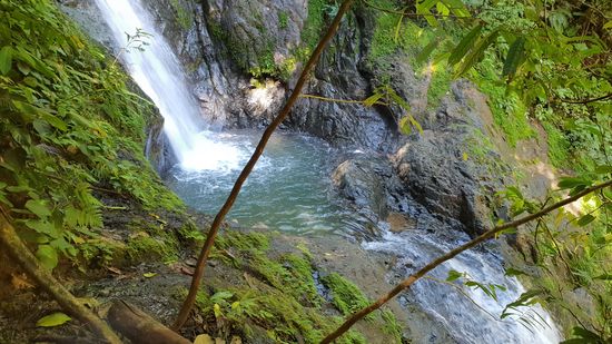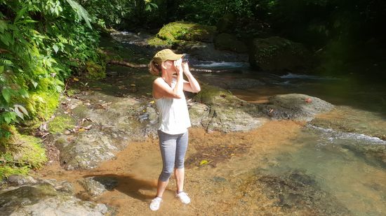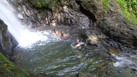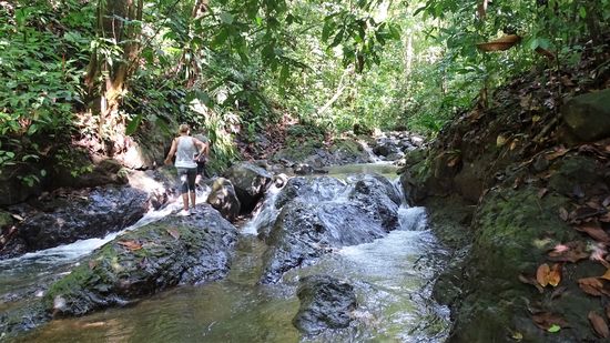 Heute treffen wir zum Frühstück auch wieder Mario und Carina (die zwei Biologen aus Boca Chica). Zusätzlich ist auch eine Volontierin Namens Jasmin mit in der Runde und bietet sich an mit uns eine kleine Wanderung zu einem schönen Wasserfall zu machen. Da lehnen wir nicht ab und los geht’s durch den Fluss und durch den Dschungel auf engen Pfaden. Der Weg hat es in sich, ich wünsch mir eine Machete, so bewachsen ist das hier alles, aber was ich bekomme sind drei Zecken (zum Glück noch nicht festgebissen). Es ist schon ein bisschen speziell mit zwei Biologen durch den Dschungel zu streifen, denn uns normales Tempo wurde auf ca. 20% davon gedrosselt, selbst Rückwärtsgehen wäre schneller gewesen. Aber Spaß beiseite, wir hatten es ja nicht eilig und die beiden haben uns wirklich so einiges gezeigt, was wir so nicht entdeckt hätten... Nochmal Danke für Eure Führung.