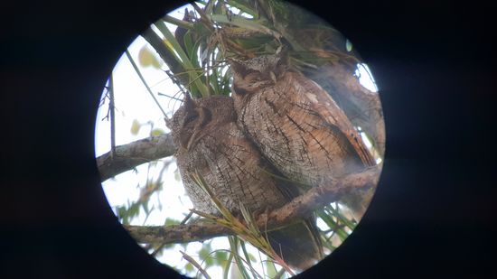 Treffpunkt Abholung um 05:30 Uhr im Café um die Ecke, da ist um diese Zeit richtig was los. Der halbe Ort ist schon hier und der Rest vom Laden wird von Touristen die in den Nationalpark wollen belagert. Carlos ist auch schon da, wir trinken einen Cafe mit Teilchen und ab geht die Fahrt ins 1,5 Stunden entfernte Carate. Schon auf dem Weg im Auto entdecket unser Führer ein Eulenpärchen im Baum. Zum Glück kann man wunderbar das Handy auf sein riesen Teleskop legen und wir bekommen super nahe Aufnahmen mit wenig Technik geliefert.