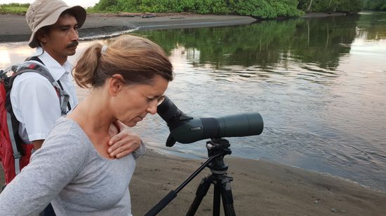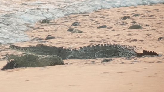 Auch heute ist um 05:00 Uhr Aufbruch um vor dem Frühstück und im Dämmerlicht die ersten Tierentdeckungen zu machen. Es geht zu einer Flussmündung, Krokodile sind unser Ziel und die lassen nicht lange auf sich warten, denn einige tummeln sich um uns, an Land und im Wasser, das größte etwa 3 Meter.