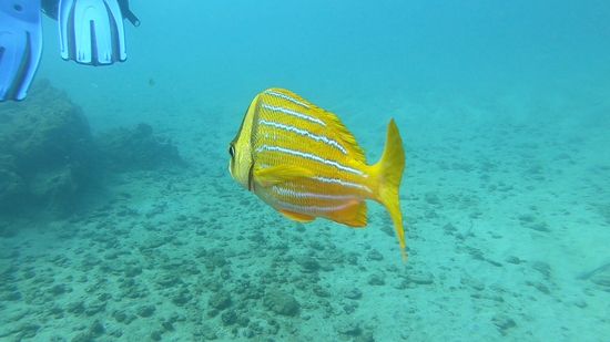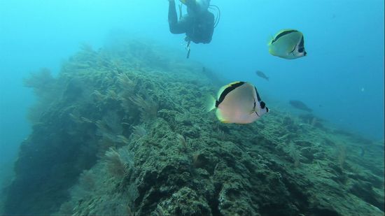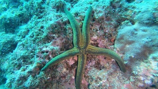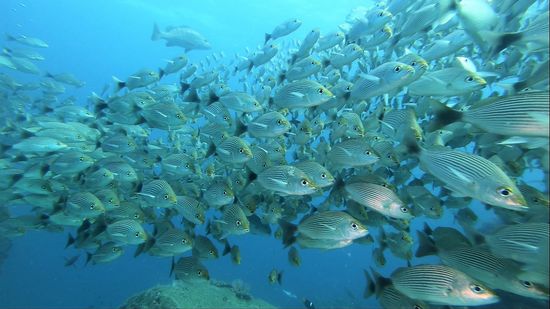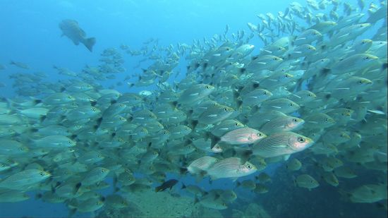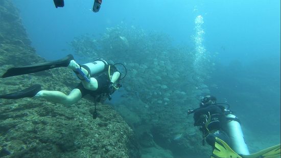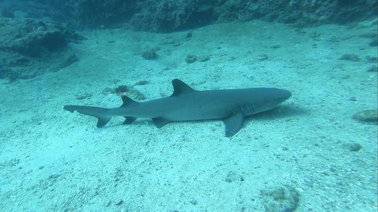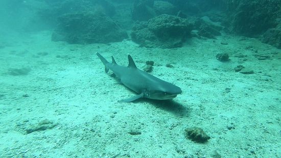 Weißspitzriffhaie, Schildkröten, Thunfisch, Schnecken, Lobster, Seepferdchen, Muränen und alle Arten von Fischen, sind hier vertreten, man glaubt es kaum bei dem öden Unterwassergelände.