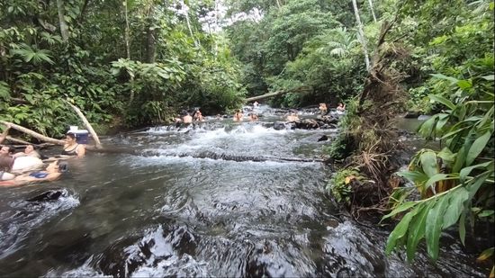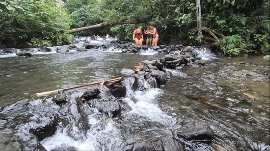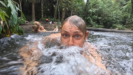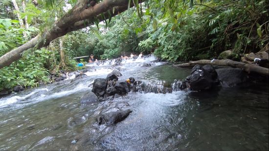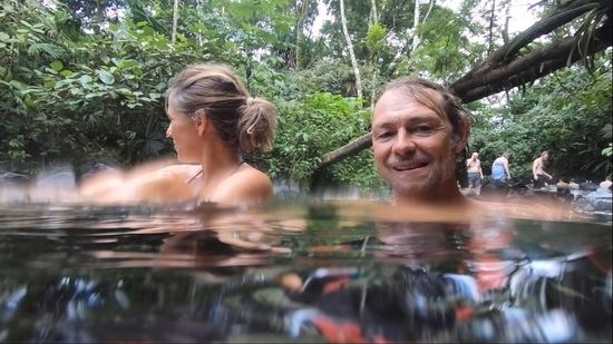 Nach dem hike fahren wir durchgeschwitzt zu den heißen Quellen, auf dem Weg zurück in die Stadt und auch die sind super. Wie in Terrassen angelegt liegen Gruppen von Menschen in eiem Becken und genießen das etwa 40°C warme Wasser. Wir finden ein freies Becken mit natürlichem Whirlpool und genießen fast 1h das herrlich klare Wasser. Jetzt ist die Reisewelt wieder in Ordnung und wir sind happy über den Tag und La Fortuna.