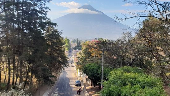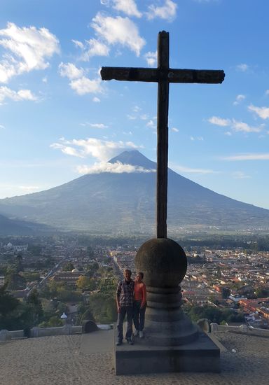 Da gestern der Himmel recht verhangen war, ist uns heute Morgen das Wetter hold und wir marschieren noch vor dem Frühstück auf den 20min. entfernten Aussichtspunkt über Antigua mit sensationellem Blick auf den Vulkan.
