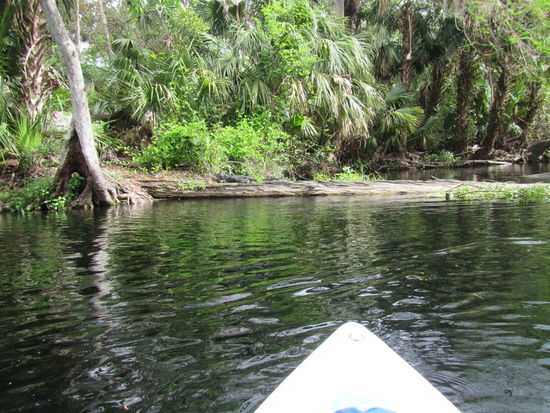 Bald wird die Strömung recht stark und das Wasser sehr flach. Da ist einige Aufmerksamkeit nötig, um nicht mit der Finne hängen zu bleiben. Flussabwärts geht es dann recht zügig. Ich paddle auch noch die knapp 2 km bis zu den eigentlichen Wekiwa Springs. Hier ist viel los, Kajaks, Kanus und einige SUP-Boards sind auf dem Fluss. Da hätte ich beinahe einen Alligator übersehen, der ziemlich reglos auf einem Baumstamm am Ufer wartete. Er lässt sich (aus respektvoller Entfernung von mindestens 5 m) auch gut fotografieren.