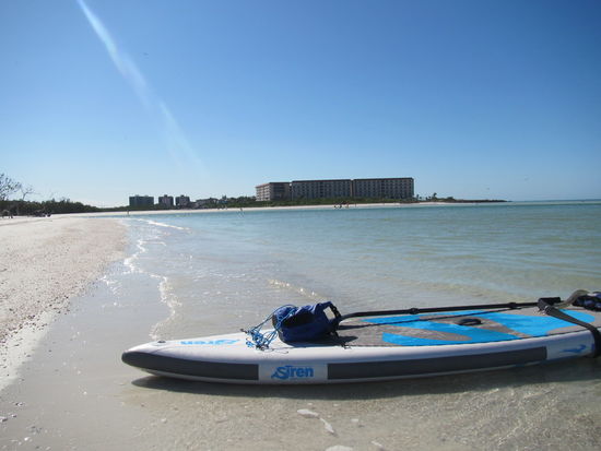 Auf dem Meer sind heute die Wellen etwa einen halben Meter hoch. Am Ende von Hickory Island paddle ich noch in die Durchfahrt "New Pass" und drehe eine Runde auf den großen Seen dort. Dann geht es am Strand weiter bis zum Strandpavillon des Lovers Key Parks.