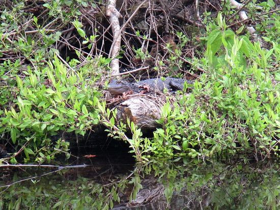 Jetzt gibt es Lunch bei Mac Rae's, Shrimp Basket und Root Beer. Anschließend sehe ich mir noch die Ruinen der Yulee Sugar Mill an. Für den Nachmittag steht der Ellie Schiller Homosassa Springs Wildlife Park auf dem Programm. Der zeigt Bären, Panter, Alligatoren, Manatees und viele andere Vertreter der Tierwelt Floridas, die man sonst nur mit viel Geduld zu Gesicht bekäme (Alligatoren und Manatees habe ich allerdings häufig in freier Wildbahn angetroffen). Den Abschluss bildet eine Bootsfahrt mit Guide, hier zeigt sich ein Baby-Alligator.