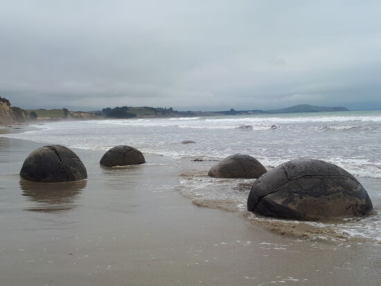 So fahren wir ein Stück weiter zu den Moeraki Boulders. Nach einem Meeresfrüchte-Mittagessen erklimmen wir verschiedene Steinkugeln, die teilweise bereits von der eingehenden Flut umspült werden. Wir haben sehr viel Spass und werden natürlich auch nass, aber was tut man nicht alles für tolle Fotos .