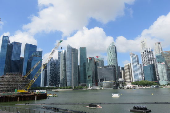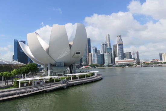 Nächster Stop ist der Merlion Park, ursprünglich am offenen Meer gelegen, zumindest habe ich es so in Erinnerung. Jetzt sehen wir vom Merlion, dem Wahrzeichen Singapurs, direkt auf den Marina Bay Sands Skypark. Dahinter liegt der Marina Bay Garden bzw. Gardens by the Bay. Diese Fläche wurde aufgeschüttet mit Sand aus dem Ausland. Um 25% wurde die Gesamtfläche Singapurs in den letzten Jahren erweitert, das sind 8000 Fussballfelder!!! Der Merlion ist ein Wasser speiender Löwe mit Fischkörper, der der Stadt den Namen Lions City verleiht.