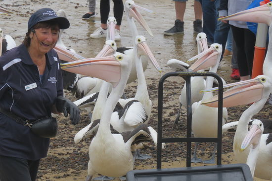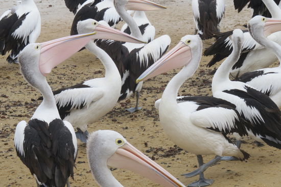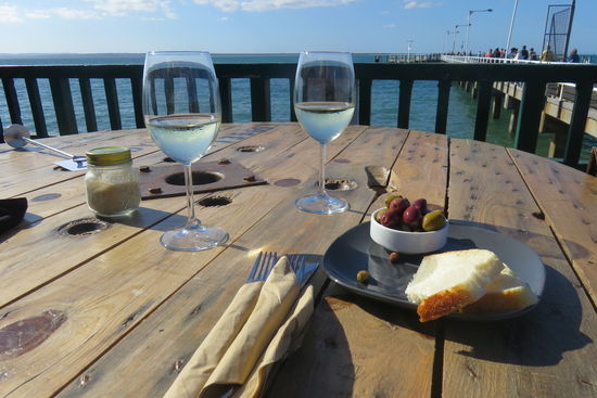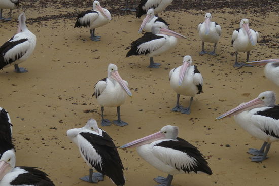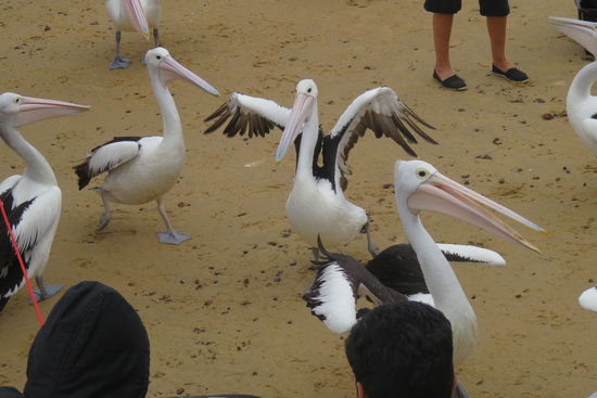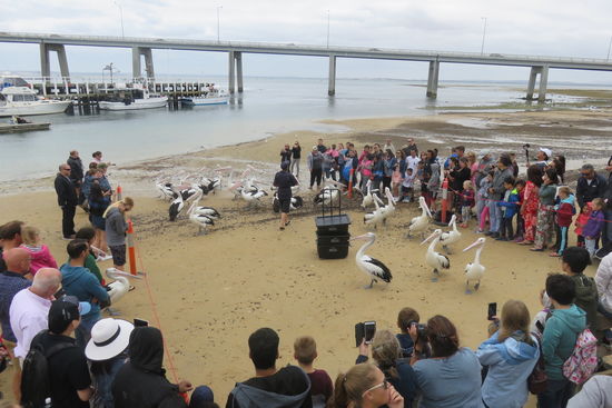Ähnlich angetan sind wir vom Pelikanfüttern in San Remo am Sonntagmittag. San Remo liegt auf dem Festland an der Brücke, die auf die Insel Phillip Island führt und somit genau New Haven gegenüber. Jeden Mittag werden als kleine Touristenattraktion die Pelikane gefüttert. Die Tiere, die sich ansonsten in der Bucht verteilen, watscheln kurz vor 12 Uhr geschlossen zu der Stelle am Ufer unterhalb der Restaurantmeile von San Remo und warten, zunächst geduldig, dann zunehmend ungeduldig auf das Futter. Eine Angestellte vom hiesigen Touristenverband zäunt mit einem roten Band zunächst eine Stelle ein, in die sich die Pelikane ohne großes Zureden selbst bewegen. Als wir sehen, wie sich die Menschen um die kleine abgezäunte Stelle herum versammeln, wissen wir, es geht mehr um die Tiere, dass sie in Ruhe ihr Futter zu sich nehmen können. Denn würden sie nicht abgeschirmt sein, die Menschen würden sie mit ihren Kameras umrennen und am Futtern hindern. Bis zu 30 Pelikane versammeln sich jeden Mittag um 12 Uhr an selbiger Stelle und werden mit von den Filets befreiten Fischköpfen und -Gräten gefüttert. Die Filetstücke gibt es als Fish & Chips im Restaurant oberhalb der Futterstelle. Wir entscheiden uns aber für Thai Küche und lernen wieder etwas Neues: Als wir ins Restaurant kommen, sehen wir auf den Tischen Wein- und Sektflaschen stehen und freuen uns auf ein leckeres Essen mit einem guten Wein zum Sonntag. Doch weit gefehlt, auf der Karte steht: B.Y.O (bring your own)., was heisst, bring den Alkohol selbst mit, fürs Aufmachen und die Gläser zahlst du 2 Dollar. Also genießen wir das Essen, den Wein, und sehr guten, trinken wir am späten Nachmittag in Cowes, einem kleinen Ort im Norden der Insel in einem spanischen Restaurant auf der Landebrücke, wo die Fähren zu den anderen Inseln abgehen. Bei herrlichem Sonnenschein genießen wir den Abend und lassen es uns bei einem guten australischem Sauvignon Blanc und warmen Oliven gutgehen. Unsere Campingfahrt nähert sich dem Ende. Nach einem Tag Zwischenstopp in Melbourne geht es für vier Tage in Innere des Landes.