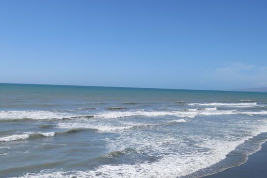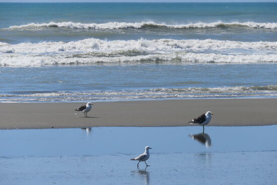 Am Nachmittag kommen wir auf dem Campingplatz an. Die einzelnen Plätze sind durch hohe Koniferenhecken begrenzt. Das schützt vor dem Wind, der ständig über die Insel zu wehen scheint und garantiert auch etwas Privatsphäre. Wir sind zumindest in unserem Eck fast allein. Aber zunächst zieht es uns an den Strand. Bereits beim Weg über die Dünen wird uns klar, wir sind auf einer Vulkaninsel. Anders als in Australien ist hier der Sand grau bis schwarz, aber sehr fein und weich. Breit zieht sich der Strand dahin bis zum Meer. Es liegt tiefblau vor uns, nur zum Strand hin bäumen sich die Wellen auf. Der starke Wellengang lockt Kitesurfer ins Wasser. Zahlreiche Einheimische sind mit ihren Hunden am Strand. Wir nehmen ein erfrischendes Bad, sehr weit schwimmen wir nicht raus, die Strömung ist recht stark. Am folgenden Tag, es ist der Tag des Erdbebens von vor acht Jahren, sind wir mehrere Stunden am Strand unterwegs. Alles ist friedlich, nichts deutet auf das Unglück von vor acht Jahren hin. Wir erfreuen uns an dem herrlichen Blick auf das Meer, die Berge in der Ferne und die Möwen im Wind.