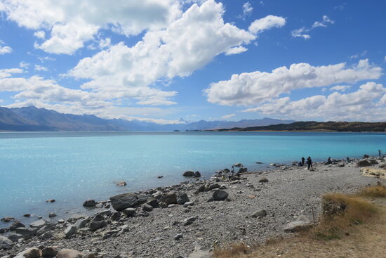Wir starten nach dem Frühstück und fahren zunächst die A1 in Richtung Süden. Vor Geraldine fahren wir auf die A 79 ins Landesinnere. Zunächst geht es an Weiden und Feldern entlang. Alles sieht ziemlich braun und vertrocknet aus. Hohe Waldbrandgefahr wird immer wieder am Straßenrand angezeigt. Nicht nur unser Sommer im letzten Jahr war zu trocken, auch hier muss es seit Wochen zu wenig geregnet haben. Überall werden Weiden und Felder mit großen Beregnungsanlagen bewässert. Und dort, wo sie bereits standen, wächst auch wieder sattes Grün. Rinder und Schafe, so weit das Auge blicken kann, Zigtausende müssen es sein. So haben wir uns Neuseeland vorgestellt. Dann geht es in die Berge. Die Schäfchenwolken hängen tief, Schatten färben die Berge dunkelbraun, bei Baumbewuchs dunkelgrün oder lassen sie hell in der Sonne scheinen. Wir kommen zum Lake Tekapo. In der Ferne die Berge, davor der Gletschersee und dort, wo die Sonne auf das Wasser scheint, zeigt es sich türkisblau, ansonsten tiefblau und so klar. Ich hatte im Vorfeld gelesen, dass Neuseeland als Naturspielplatz für Erwachsene schlechthin bezeichnet wird.. Hier trifft es zu. Die Menschen aus allen Herren Länder, ob jung oder alt, stehen am Ufer und schauen und erfreuen sich an der wunderschönen Natur. Wir fahren weiter und können uns nicht sattsehen am Wechsel der Landschaften. In der Ferne die Berge, weite Täler und kristallklare Seen, deren Farbe von Menschenhand nachverbessert scheint. Wir kommen am Lake Pukaki vorbei und sind nach einer weiteren Stunde Fahrzeit am Lake Wanaka, wo wir nach gut 6 Stunden uns für eine Nacht einquartieren. Ein schöner Campingplatz mit Blick auf die Berge in der Ferne und den See im Tal.