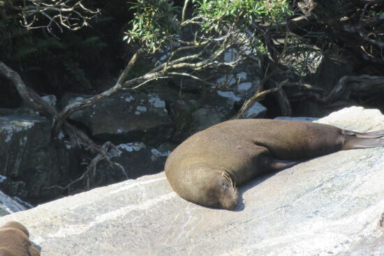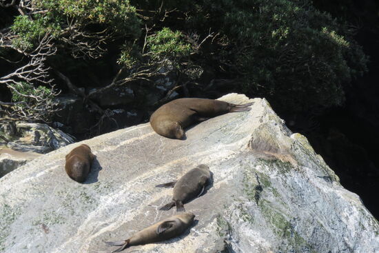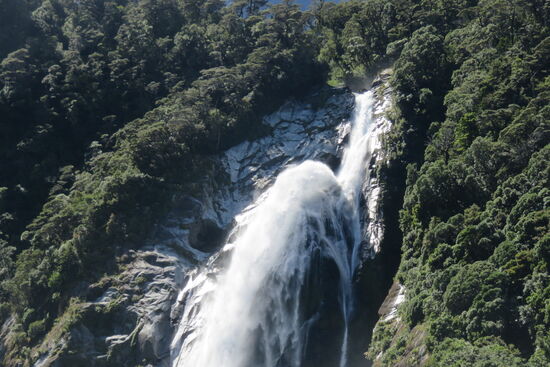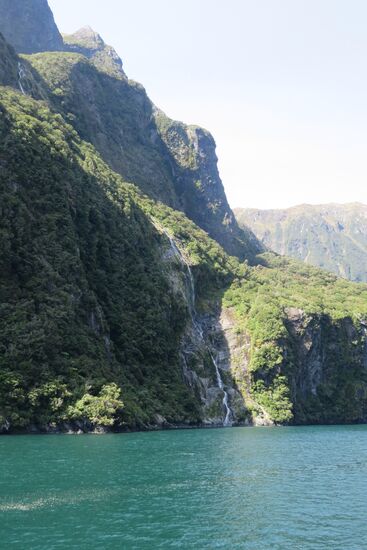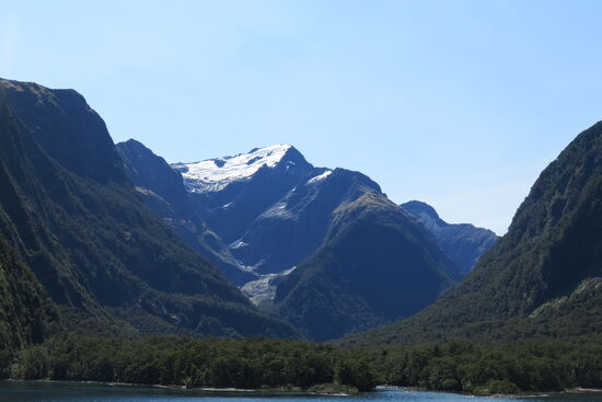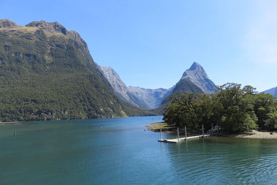 Wir kommen in Milford Sound an. Es ist der bekannteste und für den Tourismus sehr gut erschlossene Fjord in der weiten Fjordlandschaft im Südwesten Neuseelands. Der Name Sound, Sund, wurde von den englischen Seefahrern eingeführt und später einfach beibehalten. Verschiedene Schifffahrten bis zur Mündung in die Tasman See können gebucht werden. Wir haben uns für die Nature Cruise entschieden, die uns gut zwei Stunden an den hohen Bergen durch die Schluchten bis zum offenen Meer und wieder zurückführt. Neben den Schifffahrten sind auch Flüge mit Flugzeug und Helikopter über der Fjordlandschaft möglich.