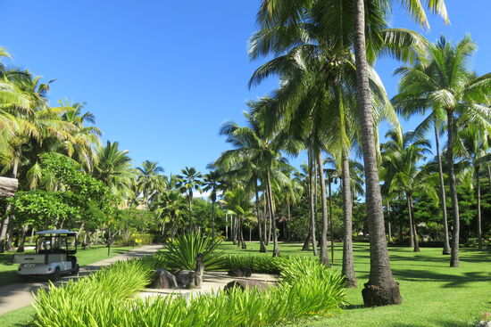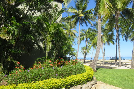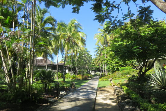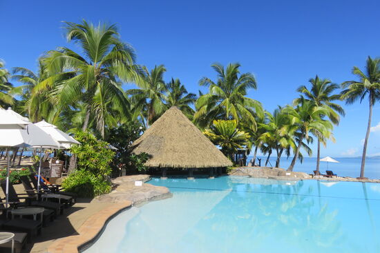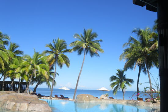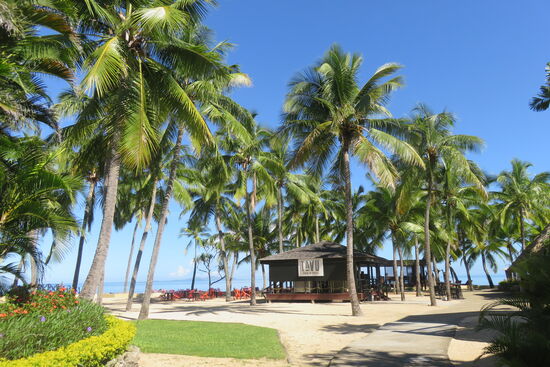 Wir sind am Eingang des Double Tree Resort by Hilton Fiji angekommen, ca. eine halbe Stunde von Nadi entfernt. Eine Fähre bringt uns auf die vorgelagerte Insel Sonaisali. Hier erwartet uns das Paradies für die nächsten Tage. Wunderschöne Anlage mit viel Platz zum Ausruhen und Entspannen, herrlichem Pool und einem großen Bereich für alle Mahlzeiten. Wir genießen die Zeit, müssen uns ein wenig vorsehen vor der Sonne trotz intensiver Vorbräunung in Australien und Neuseeland und erfreuen uns an der wunderschön gepflegten Anlage. Sie erscheint uns immer wieder wie der Garten Eden mit den vielen unterschiedlichen Gewächsen, Blumen und hohen Kokospalmen. Viel Personal ist den ganzen Tag unterwegs, um die Anlage rund um die zahlreichen Bungalows, das Hauptgebäude und zwei Apartmentgebäude zu pflegen. Wir sind in einem Zimmer mit Blick auf den Strand gleich neben Pool und Hauptgebäude untergebracht. Vom Bett aus sehen wir auf das Meer, am Abend sitzen wir auf unserer kleinen Terrasse und hören das Rauschen des Meeres. Es ist den ganzen Tag etwas los, immer tönt Südsee-Musik aus irgendeinem der Lautsprecher. Wir erleben Volkstanz am Strand, mit viel Empathie und Fröhlichkeit vorgetragen. Es sind vor allem die Menschen, deren natürliche Herzlichkeit und liebevolle Freundlichkeit uns immer wieder berühren.