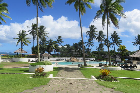 Unser neues Domizil liegt zum einen direkt an der Hauptstraße, der Queensroad, unweit eines kleinen Ortes namens Pacific Harbour und verfügt neben einer sehr großen Anlage mit Zugang zu einem kleinen Jachthafen auch über einen resorteigenen Strand am Ozean. Hier sind wir in den nächsten Tagen vor allem zu finden. Der Strand ist hell und der Sand ist weich, das Meer tiefblau, das Wasser glasklar und sehr, sehr warm. 28 Grad Celsius soll die Wassertemperatur betragen, erfahren wir später. Nur aufgrund der Tatsache, dass die Lufttemperaturen noch wärmer sind, empfinden wir jeden Gang ins Wasser als Erfrischung. Und eigentlich könnte ich mich in dem Wasser stundenlang aufhalten. Der Blick nach oben zeigt ebenso tiefblauen Himmel, zuweilen häufen sich am Horizont weiße, wirklich schneeweiße Haufenwolken. Der Strand zieht sich viele Kilometer zu beiden Seiten hin. Kokospalmen säumen den Strand. Südlich des Strandes erhebt sich eine weitere grüne Insel, sie scheint von weitem unbewohnt. Aber wir erfahren später auf unserer Schnorcheltour, dass sich dort sieben Dörfer und drei Hotelanlagen befinden. Ab und zu legen Boote mit Touristen und ihren schweren Koffern an unserem kleinen Hafen an und fahren dann mit dem Taxi weiter. Sicher kommen sie von einer der vorgelagerten kleinen Inseln und haben dort in einem der Hotelresort ihren Urlaub verbracht. Auch wir verbringen die Tage gern im Resort mit allem Komfort, die diese Hotelanlagen bieten: Poolanlage mit bequemen Liegen und Sonnenschirmen, Bar am Pool, Duschen, Südseemusik aus den Lautsprechern usw. usf. Und doch sind wir auch gern mal außerhalb der Anlagen unterwegs, um ein wenig von Land und Leuten mitzubekommen.