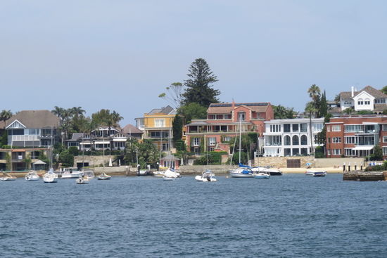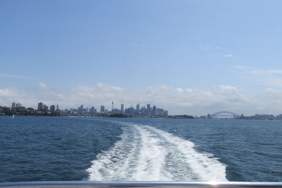 Wir entschließen uns für eine anderthalb Stunden lange Fahrt mit der Fähre nach Watsons Bay, Manley Bay und Tarangoo Zoo. Bis zum offenen Meer nimmt uns das Schnellboot mit ausreichend Platz auf dem Sonnendeck mit. Der Blick zurück auf die Skyline, das Opera House und die Harbour Bridge sind einmalig. Kleine Segelschiffe kämpfen mit den Wellen und dem stärker werdenden Wind. Es geht vor bei an kleinen grünen Inseln und Plattformen, die als Vergnügungsinseln genutzt werden. Flotte Musik ist zu hören, Es wird getanzt und gelacht. Wir fahren die einzelnen Bays an. Bis zur Küste reichen die schmucken mehrstöckigen Bungalows und Einfamilienhäuser. Anlegestege führen direkt an die makellosen Rasenflächen in hellem saftigen Grün. Hier lässt es sich aushalten! Wir können uns nicht sattsehen an der wunderschönen Umgebung der Stadt. Und jede Bay bietet eine neue unverwechselbare Silhouette. Viel zu schnell geht es zurück zum Circular Quay. Doch unsere Haut dankt es uns, dass wir die Sonne dann meiden. Bei dem starkem Fahrtwind haben wir gar nicht gemerkt, wie sie Gesicht und Arme verbrannt hat. Und dann hat Siegmund beim ersten Windzug seine Mütze, die er erst in Singapur sich gekauft hat, an das Wasser verloren. Es musste wohl so sein, denn er hatte schon mit einem Basecap mit einem Känguru geliebäugelt. Das konnte nun ohne Bedenken und schlechtem Gewissen gekauft werden. So sind wir zukünftig bestens für die brennende Sonne in Australia ausgerüstet.
