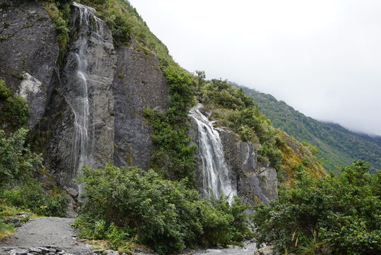 Gegen 15 Uhr kratzen wir dann doch all unsere restliche Motivation zusammen und machen uns auf den Weg zum Gletscher. Christina aus Deutschland und Aran aus Australien begleiten uns. Erst einmal müssen wir 4 Kilometer zum Parkplatz des Glacier Walks laufen, da wir nicht wissen von wo die Shuttle Busse fahren. Außerdem soll die kurze Fahrt 12 Dollar pro Person kosten. Die wollen wir uns sparen, schließlich haben wir heute noch nicht viel gemacht und können uns ruhig etwas mehr bewegen. Für den Weg zum Parkplatz brauchen wir etwa eine Stunde. Dann beginnt der eigentliche Glacier Walk. Wir brauchen weitere 45 Minuten, bis wir den Punkt erreichen, von dem wir den Gletscher aus nächster Nähe betrachten können. Kaum angekommen, fängt es ziemlich stark an zu regnen. Wir bekomme gerade so noch ein Gruppenfoto hin und machen uns schnell wieder auf den Rückweg. Aber man sagt ja, dass der Weg das Ziel ist. Unterwegs halten wir mehrmals und schießen etliche Fotos oder betrachten einfach die Landschaft und die vielen Wasserfälle.