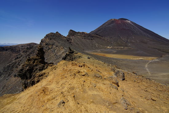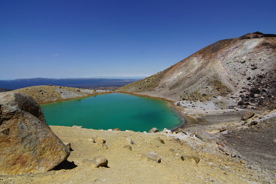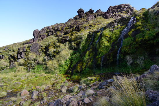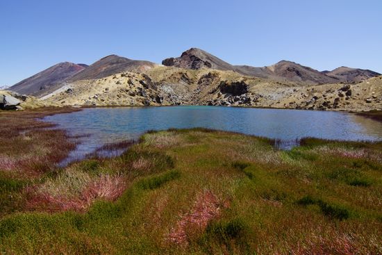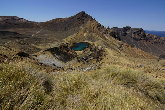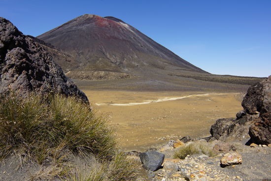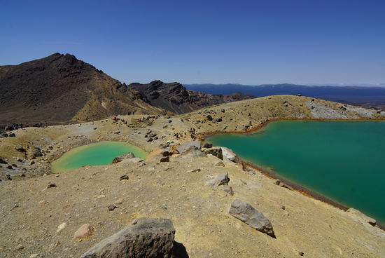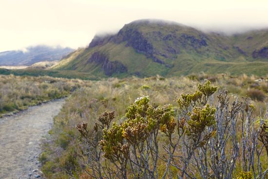 Um 05:30 Uhr klingelt der Wecker. Kein Problem für uns, wir haben ja schon früh geschlafen und ich war eh seit 5 Uhr wach. Die Wanderschuhe sind geschnürt und die Kamera-Rucksäcke gepackt. Heute haben wir den Tongariro Alpine Crossing Trek vor uns. Erst einmal müssen wir eine Stunde zum Shuttle Point fahren, wo wir unseren SUV parken. Da wir spät dran sind, beschließen wir erst einmal nicht zu frühstücken und uns am Startpunkt des Treks mit weiteren Snacks einzudecken. Der Bus ist voll mit jungen professionell gekleideten und ausgestatteten Leuten. Wir fahren ungefähr eine halbe Stunde zum Ausgangspunkt der Trekking-Tour. Der Fahrer erklärt uns noch kurz den Weg und warnt uns, dass es ab der Hälfte ziemlich hart wird. Beim Aussteigen halten wir Ausschau nach Verkaufsständen...vergeblich. Hier stehen nur zwei Toiletten und ein Informationsschild. Damit haben wir nicht gerechnet. Also geht es mit leerem Magen und etwas Proviant auf den 8-stündigen 22 km langen Trek. Unsere kläglichen Vorräte von 4 Bananen, 4 Äpfeln, 6 Müsliriegeln und 3 Liter Wasser für zwei Personen müssen wir uns wohl sorgfältig einteilen.