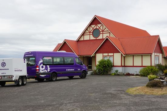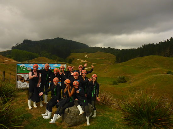 Für den heutigen Tag steht Cave-Tubing auf dem Programm. Auf Empfehlung haben fast alle die Tumu Tumu Tubing Tour gebucht, sodass wir als Gruppe die Waitomo Caves erforschen können. Wir starten pünktlich um 7 Uhr von unserer „Lava Lodge“ und erreichen nach etwa 1,5 Stunden die Station des Veranstalters „Waitomo Adventures“ kurz vor dem Waitomo Cave Village. Nach einer kurzen Einweisung geht es auch schon los. Alle werden in einen kleinen Bus verfrachtet, der uns kurz vor den Eingang der Höhle bringt. Die Höhlen gehören den Farmern, denen auch das Land gehört. Uns wird erklärt, dass die Farmer die Höhlen entdeckt haben, weil ihre Schafe dort nach und nach hineingefallen sind. Da die Regierung die Beschwerden der Farmer ignoriert hat, haben diese ihre Chance einfach genutzt und machen heute richtig Geld mit den Cave-Touren. Unsere beiden Guides stellen uns die übliche Frage „Are you nervous?“ Alle antworten mit „Nooo“. Auf die Bemerkung „You didn‘t hear about Thailand?“ reagierten alle nur mit einem verhaltenen Lachen und sind danach erst einmal still. Die Farmer haben auf ihren Feldern eine Hütte mit Duschen und Toiletten aufgebaut, in der wir uns umziehen können. Jeder bekommt einen dicken Wetsuit mit Jacke, Gummistiefel und einen Helm. In diesem schicken Outfit muss natürlich auf ein Gruppenfoto gemacht werden.