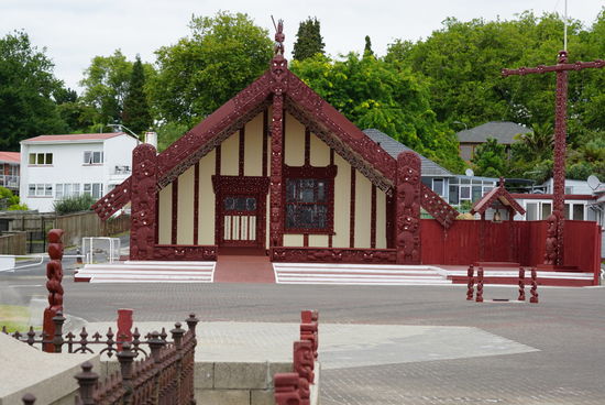 In Rotorua schmeißen wir kurz unser Gepäck ins Hostel und weiter geht‘s. Das Maori-Dorf ist sehr klein. Aus jedem Loch dampft oder brodelt es. Wir treffen unseren Maori-Guide, der uns viel über die Kultur und das Dorf erzählt. Vor Kurzem waren erst Prinz Harry und Megan zu Besuch. Die Maori nutzen die Schwefelquellen beispielsweise zum Heizen, Duschen oder Kochen. Jeder Mitbewohner hat ein eigenes Dampfbad im Garten. Wir messen die Temperaturen des Bodens vor der Kirche. Das Thermometer zeigt zwischen 80 und 100 Grad an. Ohne Schuhe lässt es sich hier nicht lange aushalten. Später kommt noch seine Familie dazu und wir begrüßen uns alle nacheinander mit dem Maori-Begrüßungsritual. Nun kommt unser Auftritt: Chief Shaman hält eine kurze Rede und bedankt sich für die Einladung und wir müssen unser Lied „Three Little Birds“ vorsingen. Deshalb mussten wir während der Fahrten ständig mitsingen. Alle gucken etwas überrascht aber wir trällern, nuscheln oder summen die ersten beiden Strophen vor uns hin. Die Familie konnte den Text besser als wir.