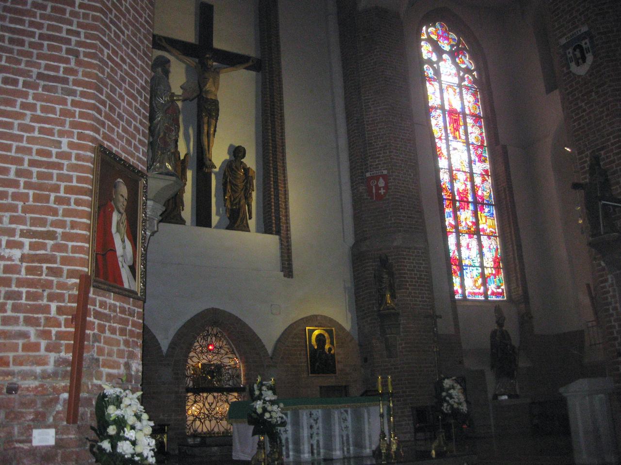 Die Kirche ist im Inneren durchaus sehenswert mit schönen bunten Fenstern, der Renaissancekanzel, dem bronzenen Taufbecken und dem Triptychon von 1510.