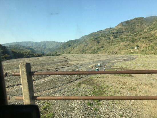 Wir schleppen uns mit maximal 20km/h durch die Berge. Rechts ist der Abhang und es geht in die Tiefe—links die steile Felswand. Unentwegt dringt Staub durch die Fenster rein. Aber die Fenster zu schließen, ist undenkbar, dann würden wir ersticken!