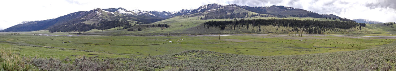 Bei genauer Betrachtung sieht man auf der weiten Flussebene lauter schwarze Punkte. Je länger man hinblickt, umso mehr Punkte sieht man. Hunderte, vielleicht tausend oder mehr. Jeder Punkt ist ein über 600kg schweres Tier. Jeder Punkt ist ein BISON! Unglaublich, dass Bisons vor 100 Jahren an der Grenze der Ausrottung waren!