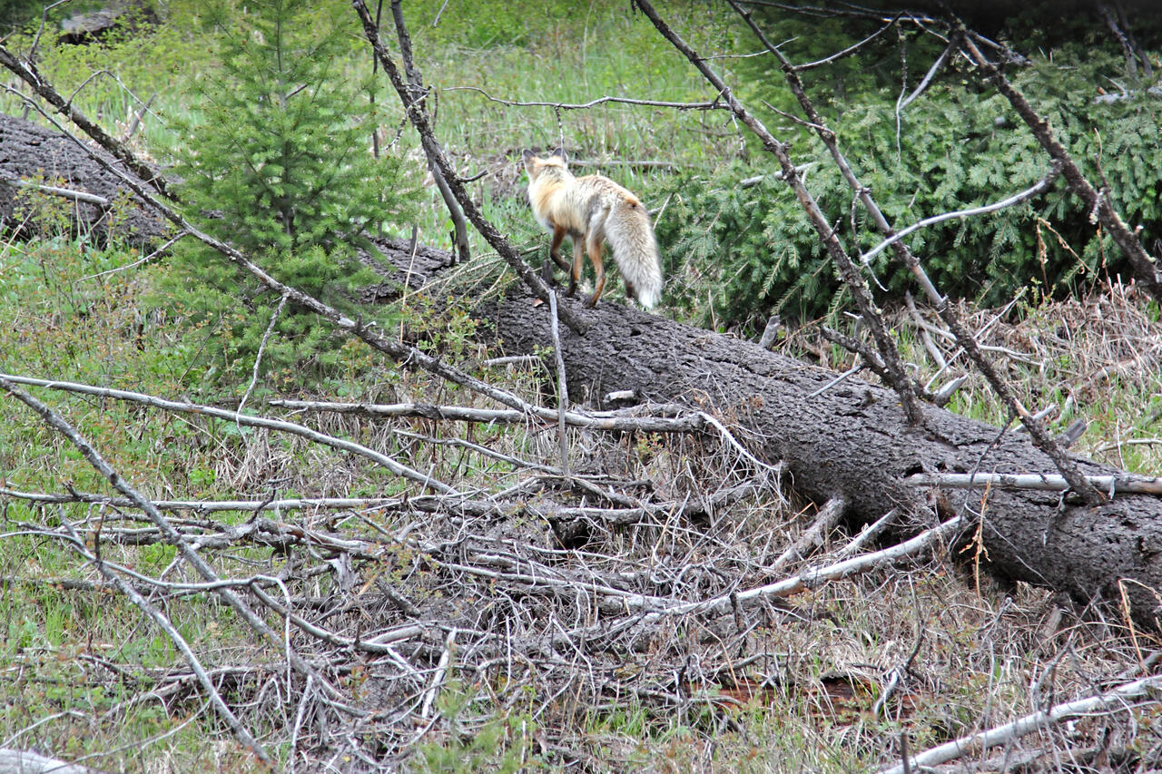 Der Rotfuchs (Vulpes vulpes) wurde seit den 1880er Jahren in Yellowstone dokumentiert. Im Vergleich zu anderen Hundeartigen ist der Rotfuchs der kleinste. Rotfüchse tragen ihr Fell je nach Jahreszeit in verschiedenen Farben, aber im Gegensatz zu Kojoten haben sie immer diesen Rotton und oft auch "schwarze Socken". Ausserdem sind Kojoten viel grösser, aber das könnte man nur im direkten Vergleich gut sehen. Die meisten Füchse in den zusammenhängenden 48 Staaten der U.S.A. sind eine Unterart des europäischen Rotfuchses. Sie wurden im 18. und 19. Jahrhundert zur Fuchsjagd und Fellzucht eingeführt, flüchteten von den Farmen und breiteten sich allmählich in Richtung Westen aus. Die Anzahl der Füchse in Yellowstone ist unbekannt, dürfte aber weit unter der Zahl der Kojoten liegen.