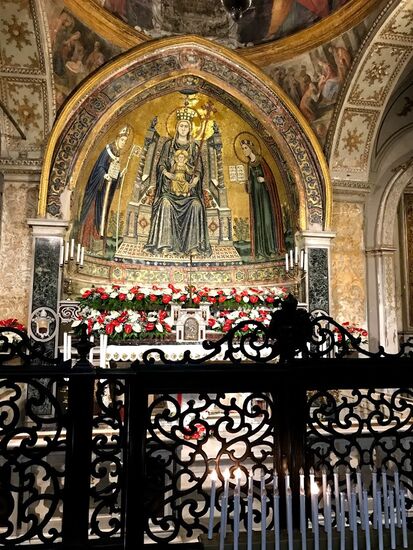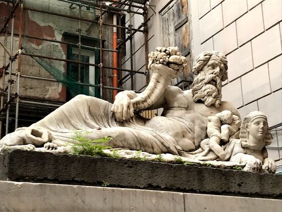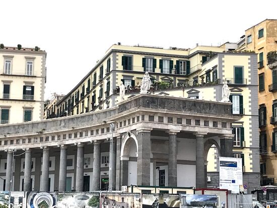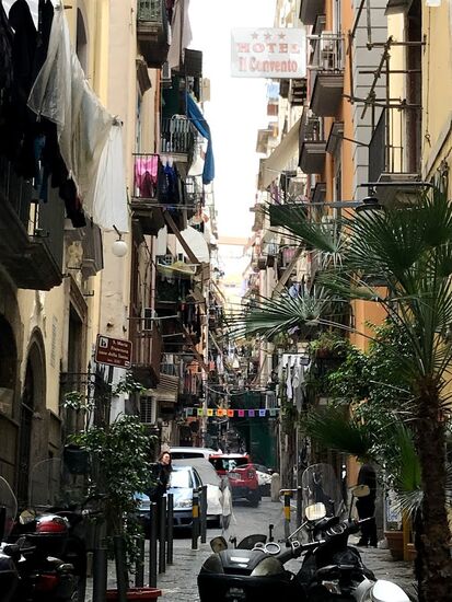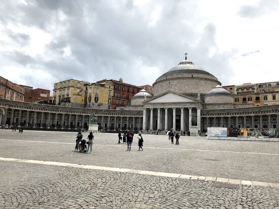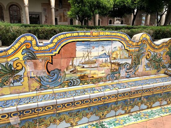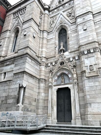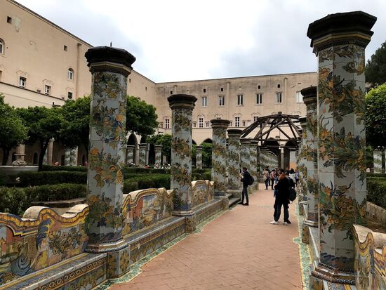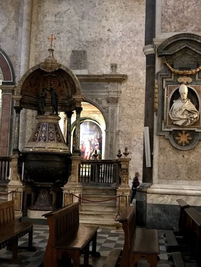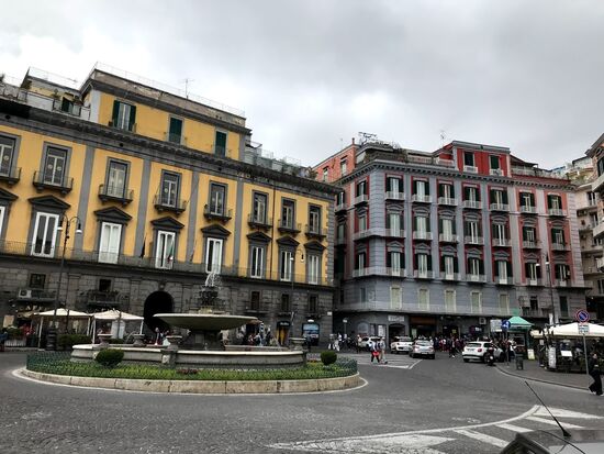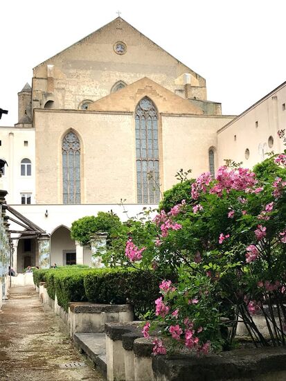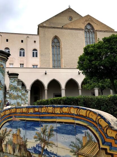 Neapel ist eine quirlige Stadt, die sicherlich nicht die sauberste ist, aber einen speziellen Charme hat. Nachdem wir die Basilika Santa Chiara und den Kreuzgang des Klosters besichtigt haben, stärken sich Teile der Gruppe erst mal mit einer Pizza im Schatten des Domes. Heute ist Samstag und Hochzeiten werden gerne Samstags abgehalten, daher werden wir auch Zeuge einer solchen. Nicht geklärt ist, ob der Angetraute viel älter als die Braut ist oder einfach nur schütteres Haar hat . Die Braut wird es wissen...