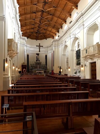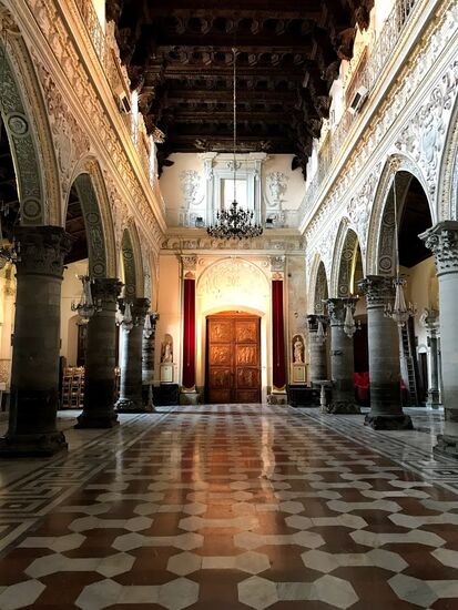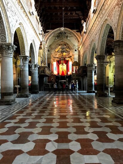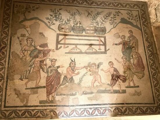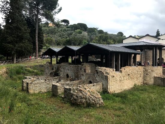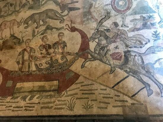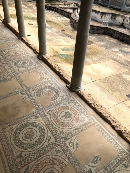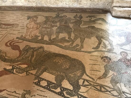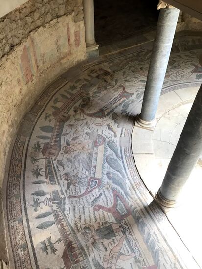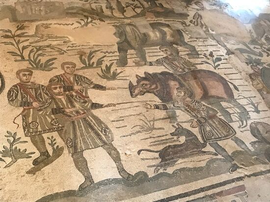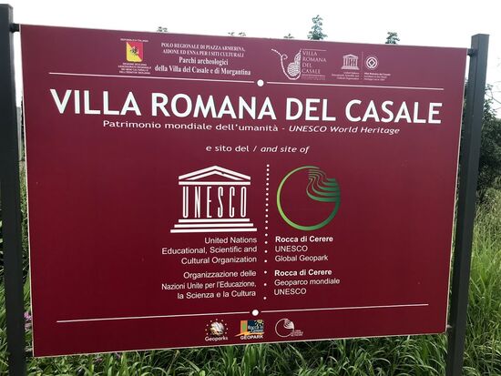 Von unserem letzten Hotel geht es nun noch einige Zeit die Südküste entlang, bevor wir ins Landesinnere abbiegen. Unser erster Weg heute führt uns zur Villa Romana del Casale (eine spätrömische Villa) in der Nähe von Piazza Armerina. Bekannt ist sie für ihre sehr gut erhaltenen Bodenmosaiken, die aus 120 Mio. einzelnen Steinen bestehen. Nach dem Rundgang durch die Räume (ein paar Mosaiken sind unten zu sehen) und einer Mittagspause geht es in einer spannenden Busfahrt durch enge Kehren weiter zum "Nabel" Siziliens, dem auf einer Bergkuppe hockenden Enna, ein hübscher Ort, den Goethe folgendermaßen beschrieben hat: