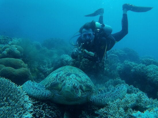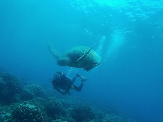 Der Tag sollte ein Highlight unserer gesamten Tour werden, aber das wussten wir natürlich noch nicht, als sich unsere Tauch-Bangka gegen 8 Uhr vom Strand in Dauin auf die ca. 45-minütige Fahrt nach Apo Island machte. Es sollte Schildkröten geben. Dass es am Ende des Tages so viele sein würden, dass ich irgendwann aufgehört habe, sie zu zählen, hätte sich keiner von uns zuvor erträumt. Ich hatte das große Glück, meine insgesamt drei Tauchgänge nur mit einem Philippino als Buddy zu genießen und dementsprechend war es äußerst entspannt. Kein Rudeltauchen, nur wir beiden. Und wir waren kaum im Wasser, da zog auch schon die erste Echte Karettschildkröte an uns vorbei. Und dann ging es eigentlich Schlag auf Schlag und das während aller drei Tauchgänge. Turtles, Turtles, Turtles. Und das in allen Lebenslagen. Schildkröten, die gerade ihr Mittagessen verspeisten, Schildkröten, die gerade ihr Mittagsschläfchen auf dem Dach der Korallen machten, Schildkröten, die immer mal wieder an die Wasseroberfläche schwammen, um nach dem Rechten zu sehen (also eigentlich um Luft zu holen). Und jede einzelne konnte man von so nahem und über eine so lange Zeit begleiten, dass es kaum zu fassen war. Minutenlang konnte ich immer wieder direkt neben riesigen Merresschildkröten tauchen, nur Zentimeter entfernt, jedes noch so kleine Detail aufnehmen, beim Fressen zuschauen, Putzerfische beobachten, die sich am Panzer andockten, um dort auch ihr Mittagessen zu finden. Es war einfach nur ein Fest für die Augen und obwohl ich seit ca. 25 Jahren tauche, war es einer der Tauchtage meines Lebens. Sandra erging es währenddessen schnorchelnderweise kaum anders. Auch sie kam nur mit Maske, Schnorchel und Flossen so nah an die Schildkröten heran, dass sie sie jederzeit hätte anfassen können. Soll man aber nicht und wir haben uns auch daran gehalten. An dem Glänzen in Sandra´s Augen konnte ich sehen, wie bewegend auch für sie die Momente mit diesen unbeschreiblich schönen Tieren unter Wasser waren. Die Unterwasseraufnahmen dürften für sich sprechen.....