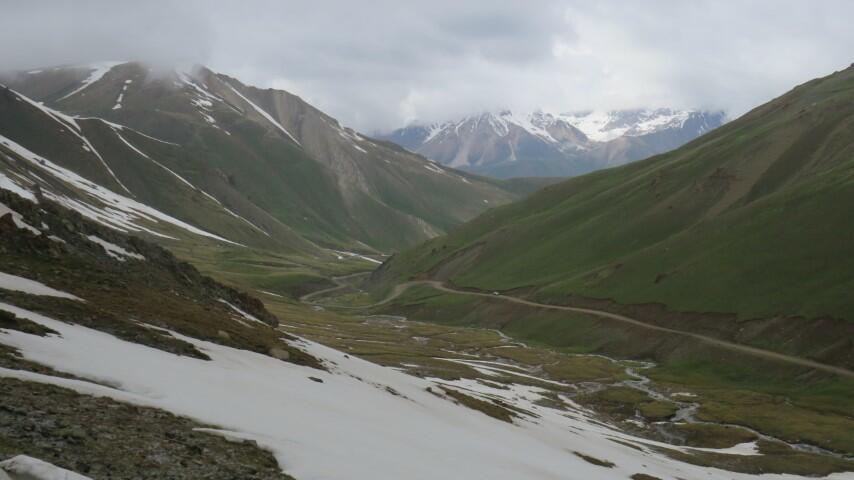 Auch ein Bus von Dragonman, einem dieser britischen Overlander-Busreiseunternehmen hat eines der Camps bereits mit Beschlag belegt. Wir überqueren auf bequemer Schotterpiste den geräumten Kalmar-Ashuu Pass 3450m,
