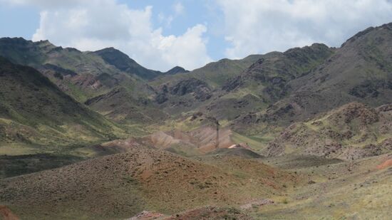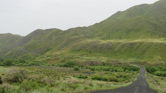 zum Altyn Emel NP, den wir aber beim letzten Mal hierdurch schon besucht, seine singende Düne bewundert haben. Im Ort Altyn Emel biegen wir Richtung Norden ab und plötzlich, am Rande der Berge ändert sich das Landschaftsbild, was bisher noch trockene Steppe war