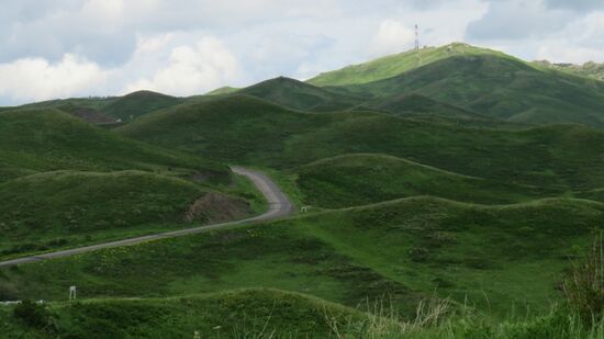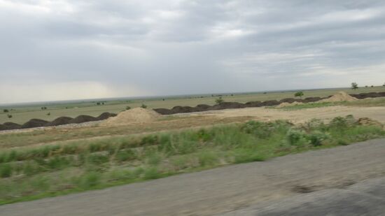 wird plötzlich zu einer grünen Weidelandschaft, Allgäu Feeling kommt auf, doch schon etwa 30km weiter das bekannte Bild graubraun in graubraun. Wir erreichen Taldykorgan gehen dort noch schnell in einen Supermarkt (etwa so gross wir bei uns der Real) zum Vorräte auffüllen und dann hat uns die grausame Realität eingeholt, wir müssen zum ersten Mal auf die A3. Am Stadtausgang noch die berühmten Schlaglochpisten, doch schon bald fahren wir mal durch und mal um endlose Baustellen. Offensichtlich wird die ganze Strasse neu gebaut und dabei gleich auf 4-spurig erweitert. Staub und Schotterstrecken wollen kein Ende nehmen. Nach 2 Stunden fahren wir leicht genervt rechts ab, beziehen hinter einem Hügel unseren SP und werfen das T-Bone in die Pfanne, das wir uns kurz vorher noch im Supermarkt gekauft haben.