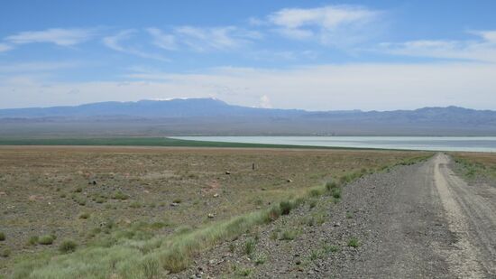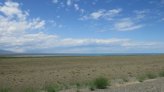 und macht das ja fast noch Spass, aber hier quälen sich auch 30t Lastzüge im Schritttempo durch. Auf einem Damm entlang des Lake Zharlanashkol überqueren wir das Sumpfland,