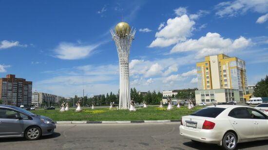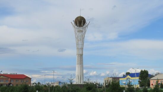Richtung Innenstadt. Am zentralen Kreisverkehr wie so oft ein Bayterek Monument, Sinnbild der Kasachischen Legende, die davon erzählte, dass der mystische Vogel Samruk in einem Baum ein goldenes Ei ablegt, das all die Geheimnisse der menschlichen Wünsche und Glückseligkeit enthält.