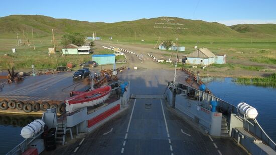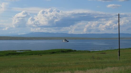 aber dann schlägt die Inkompetenz zweier Dorfpolizisten erbarmungslos zu. Gute 90 Minuten stehen wir dumm rum, die zwei, noch nie einen fremden Pass gesehen, warten auf Hilfe aus der Kreisstadt, die aber nicht kommt, aber bevor wir die Fähre zum zweiten Mal auch noch verpassen (es ist mittlerweile fast 19 h) bekommen wir unsere Pässe zurück, dürfen weiterfahren, bekommen als Entschuldigung sogar noch einen gerauchten Karpfen geschenkt, den sie den Fischverkäuferinnen hier mittlerweile abgekauft haben. Schwamm darüber, wir sind wieder unterwegs, die Fähre bring uns für Kzt 3.200 über den Fluss
