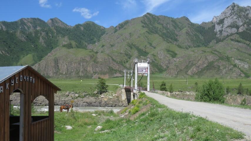 und fahren weiter Richtung Süden, in der Hoffnung eine Brücke über den Katun und einen unserem Navi unbekannten Weg über die Berge zu finden. Bereits nach 15km stehen wir an der Oroktaiskiy Brücke und fragen in dem kleinen Restaurant links im Bild, ob es hier einen Weg durch / über die Berge gibt.