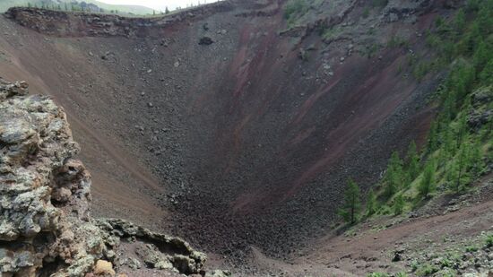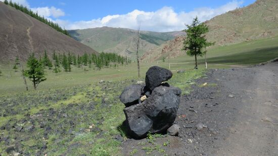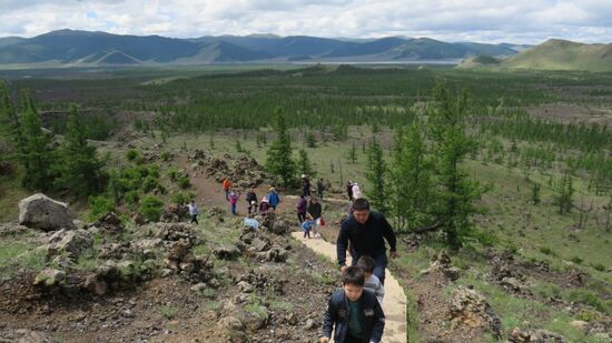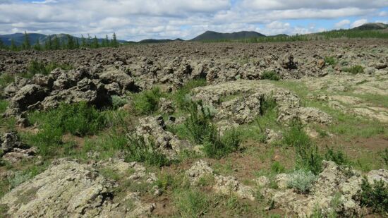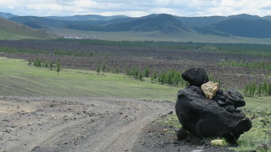 wieder einmal eine schöne warme Dusche zu gönnen (MNT 4.000 pP). Und da wir schon mal hier sind, schauen wir uns anschliessend noch den gerade mal um die Ecke liegenden erloschenen Vulkan an. Bereits bei der Anfahrt queren wir solche Lavafelder,