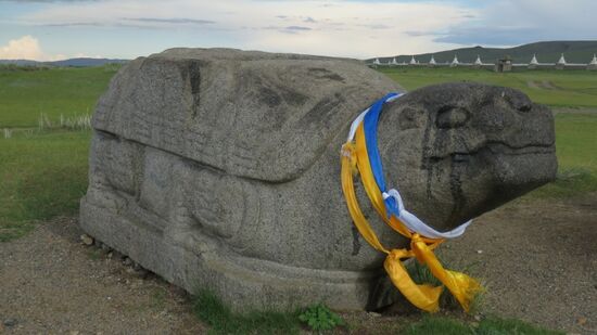 Draussen vor der Anlage noch eine von 4 steinernen Schildkröten, die einst die Grenzen der Stadt Kharkhorin markierten.