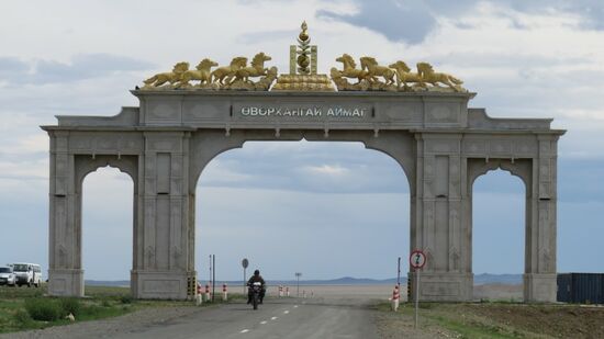 geht es weiter nach Arvaikheer, einer weiteren Provinzhauptstadt, die Einfahrt mit einer Mautstelle (MNT 1000) und diesem riesigen Tor geziert,
