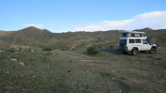 drinnen in der Stadt bieten ein Markt und mehrere Supermärkte nochmals eine Möglichkeit zum Ausfüllen der Vorräte. Auf dem weiteren Weg Richtung Westen wird die immer noch geteerte Strasse denkbar schlechter, in Vorbereitung für kommende Reparaturen wurden riesige rechteckige Löcher in den Belag gehackt, was die Fahrt mehr oder weniger zum Slalom macht. Etwa SP 80km vor Bayankhongor geben wir für heute genervt auf und suchen uns einen SP in den Hügeln.
